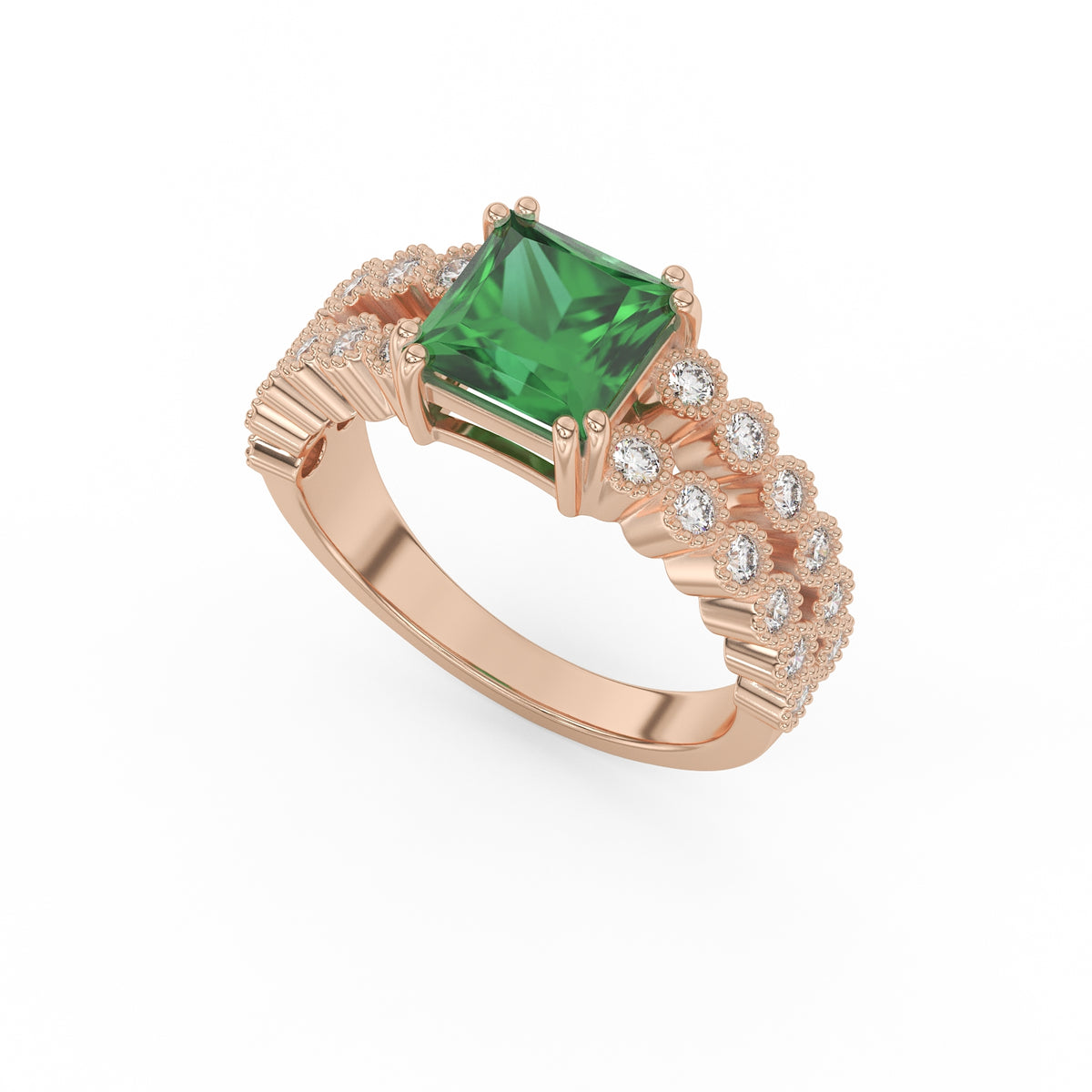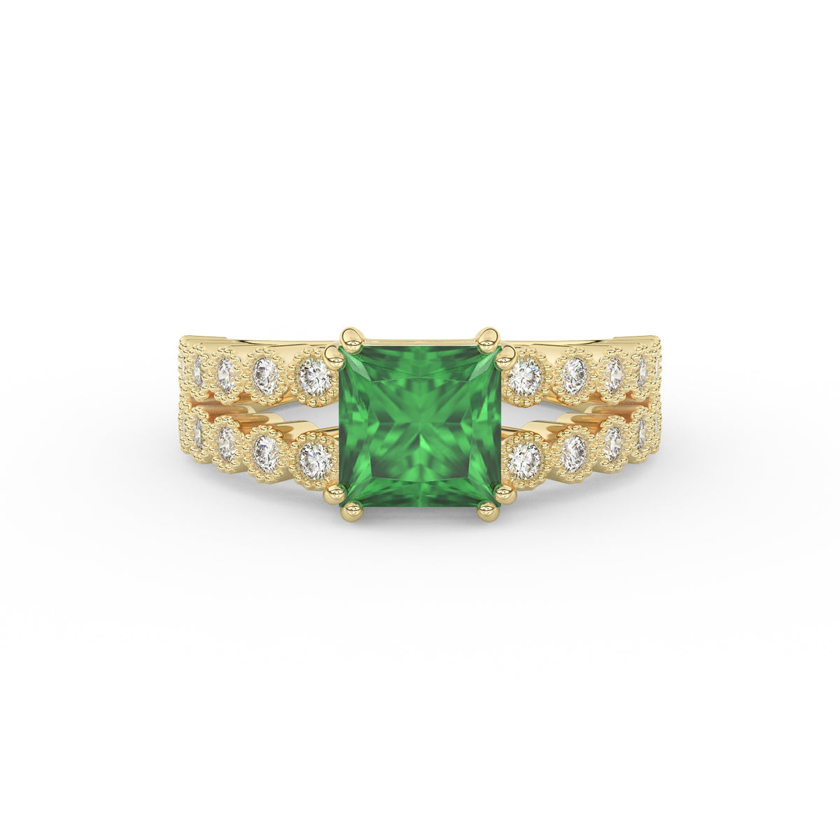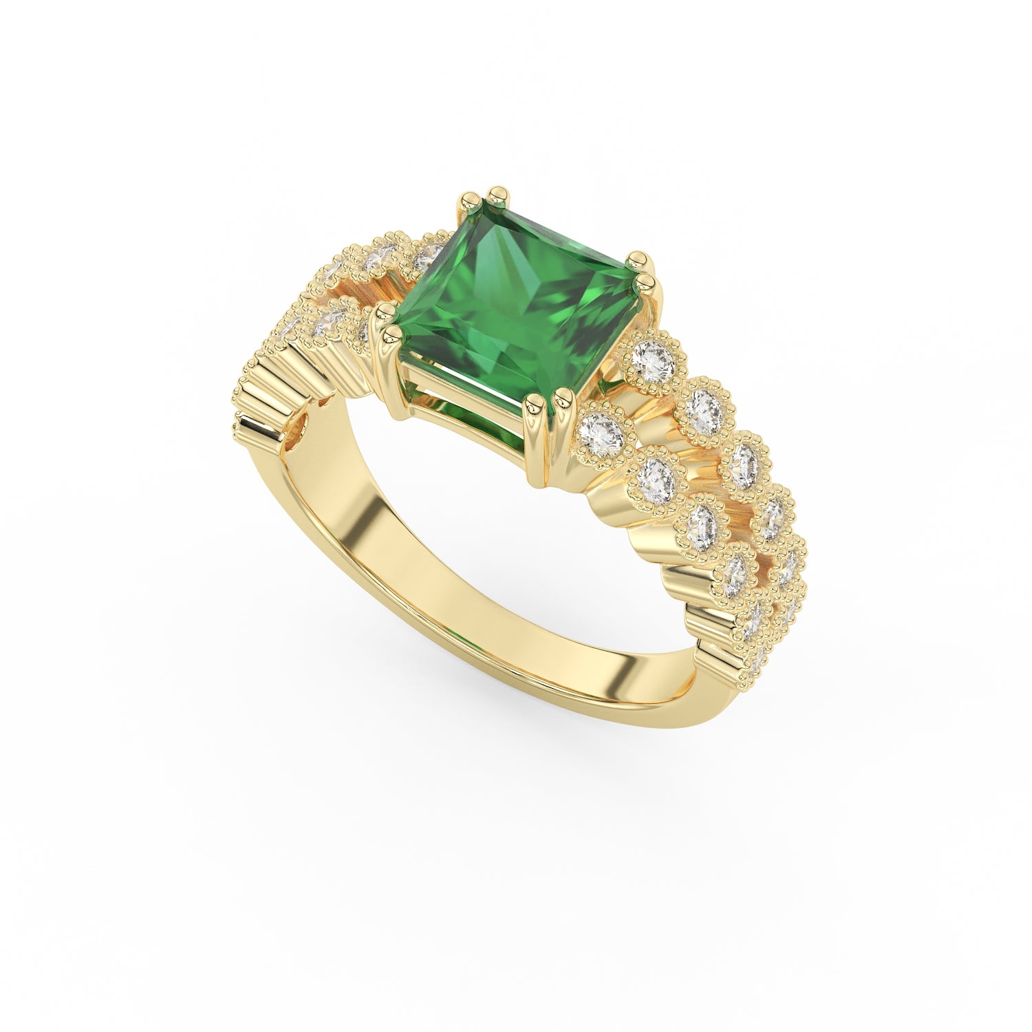 Prix unitaire / parDécouvrez l’élégance intemporelle de cette somptueuse bague en Or 18K, d’un poids total de 6 g. Au centre, une émeraude taille princesse de 1,72 carat est sertie sur 8 griffes (2 par côté), assurant une stabilité parfaite et une mise en lumière optimale.