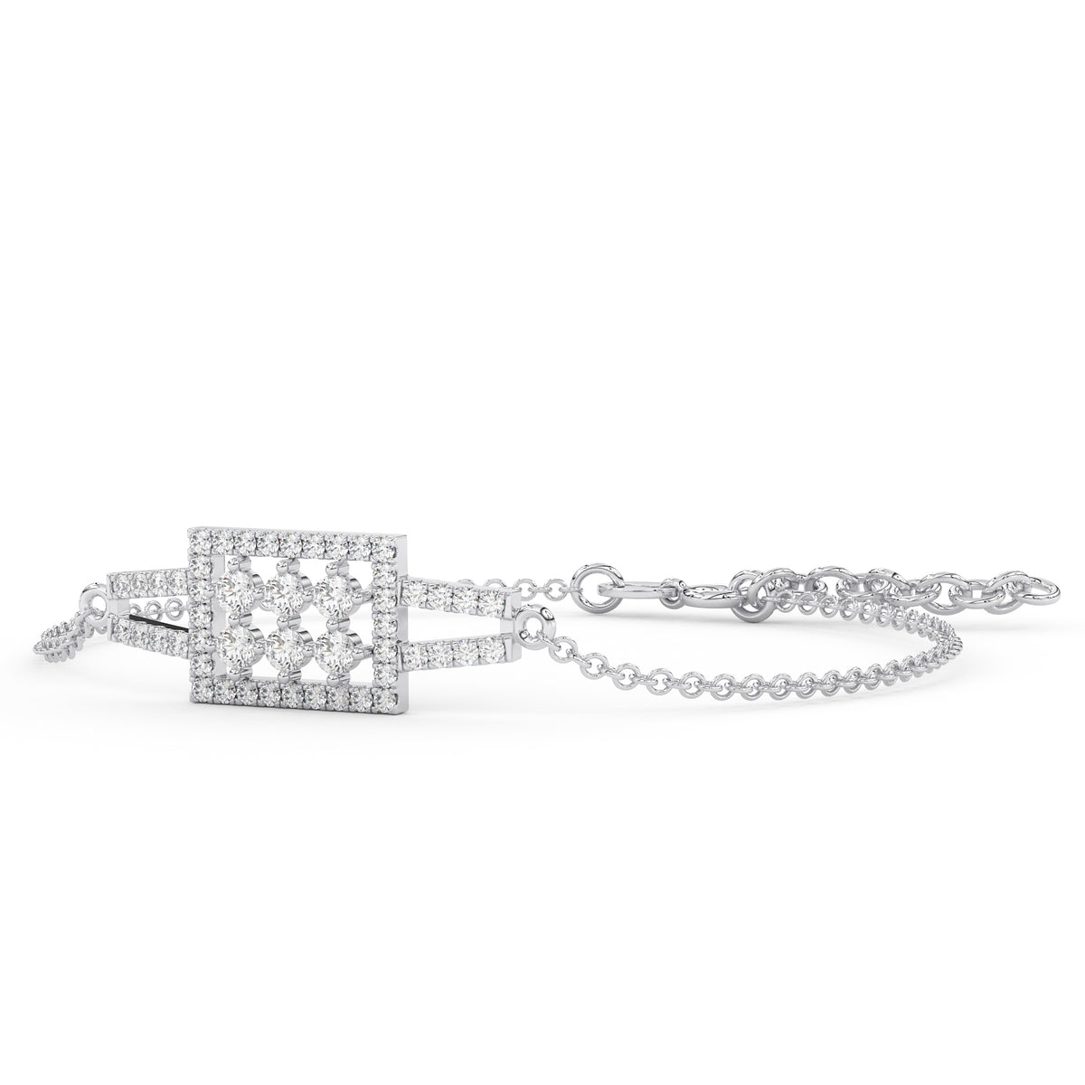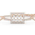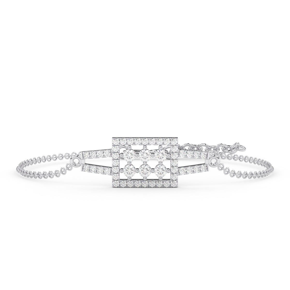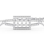 Ces diamants centraux sont mis en valeur par un rectangle serti, dont les lignes nettes et précises encadrent la composition. Autour de cette structure, 44 diamants de pavage, représentant 0,29 carat, sont minutieusement posés de part et d’autre. Leur sertissage délicat prolonge l’éclat et confère au bracelet une brillance continue, sans alourdir la silhouette.