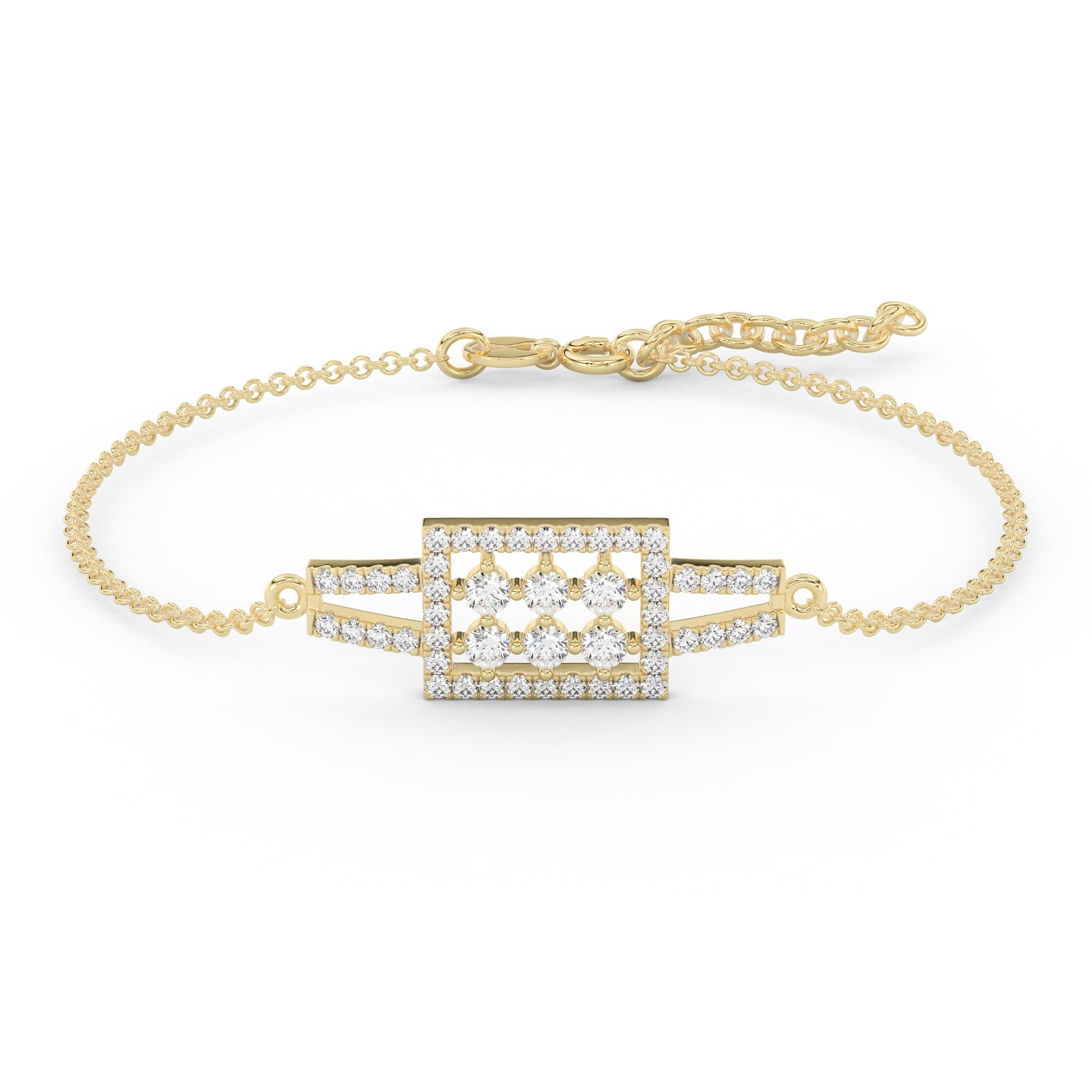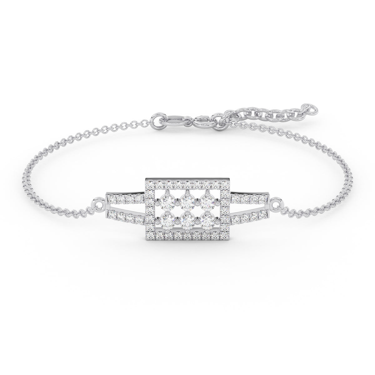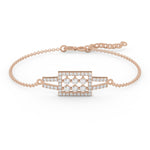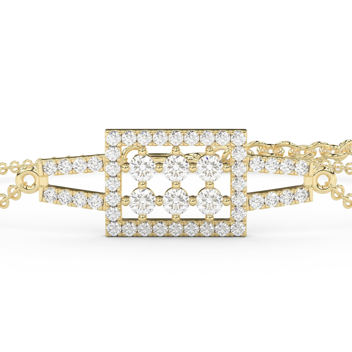 Prix unitaire / parCe bracelet COURONNE CARRÉE, reprend la signature géométrique et lumineuse de la collection. Au centre, six diamants ronds, totalisant 0,28 carat, sont alignés horizontalement en deux rangées de trois pierres. Cette disposition symétrique, à la fois épurée et équilibrée, crée un motif scintillant d’une grande finesse.