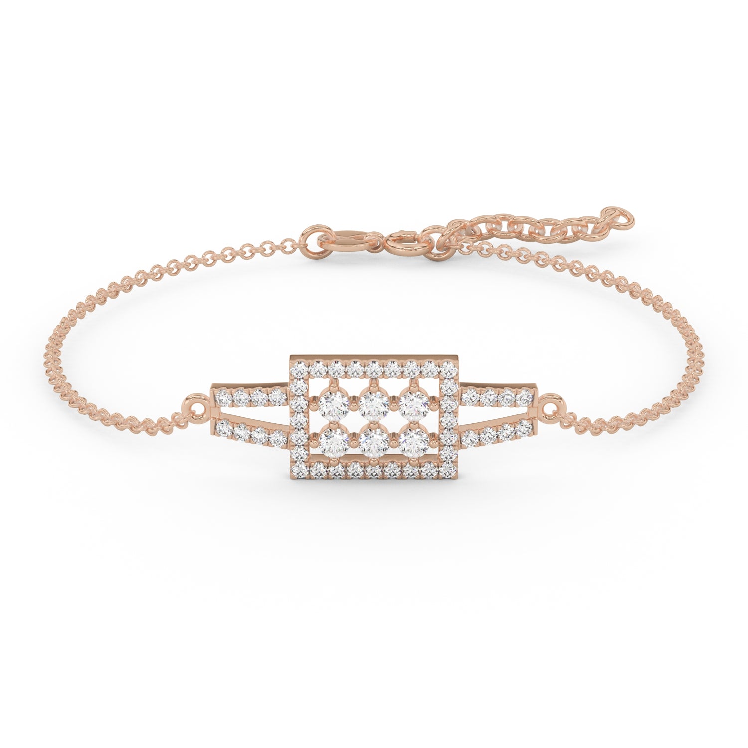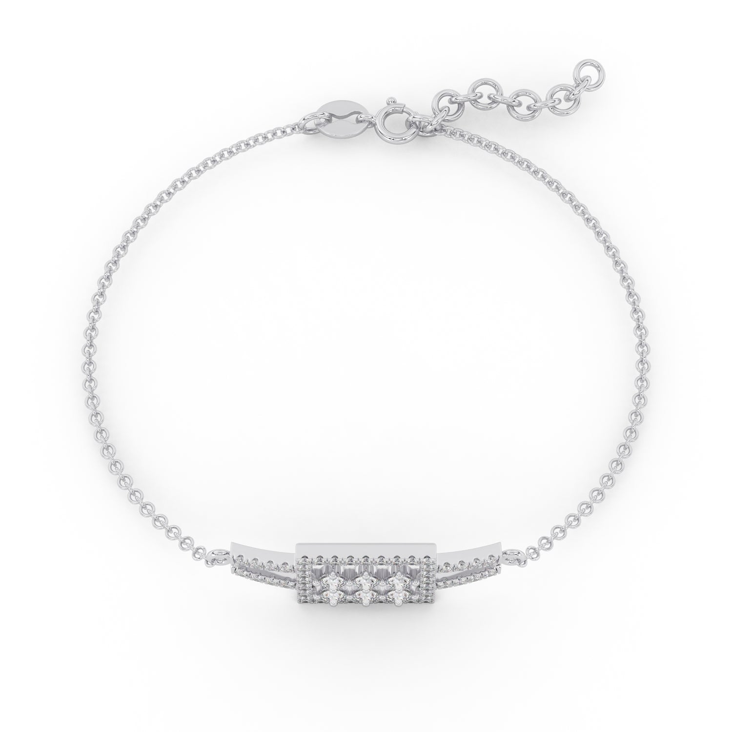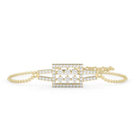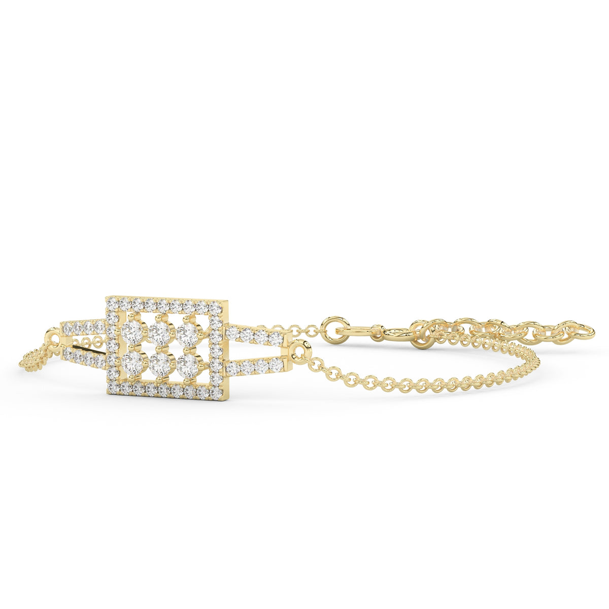 Prix unitaire / parCe bracelet COURONNE CARRÉE, reprend la signature géométrique et lumineuse de la collection. Au centre, six diamants ronds, totalisant 0,28 carat, sont alignés horizontalement en deux rangées de trois pierres. Cette disposition symétrique, à la fois épurée et équilibrée, crée un motif scintillant d’une grande finesse.