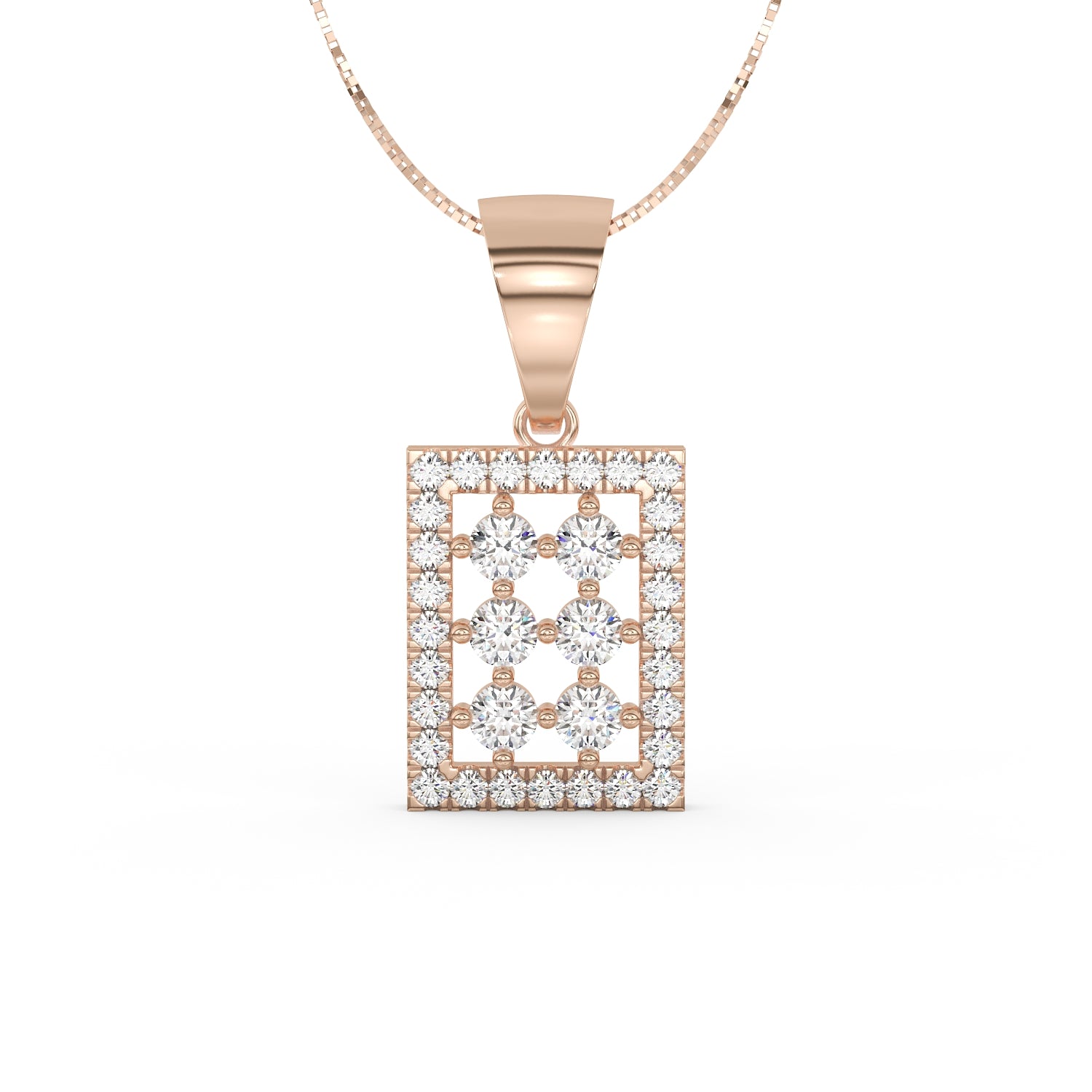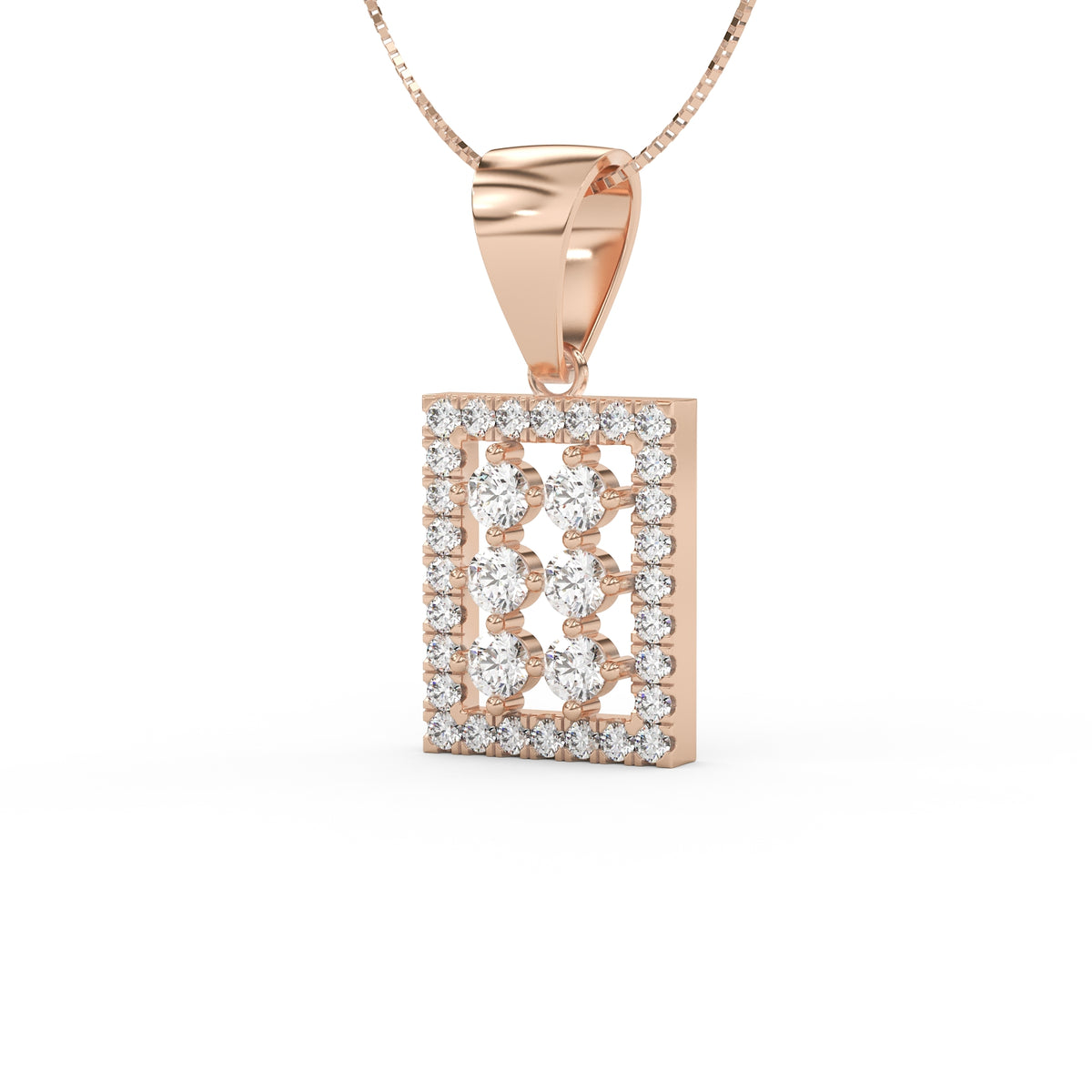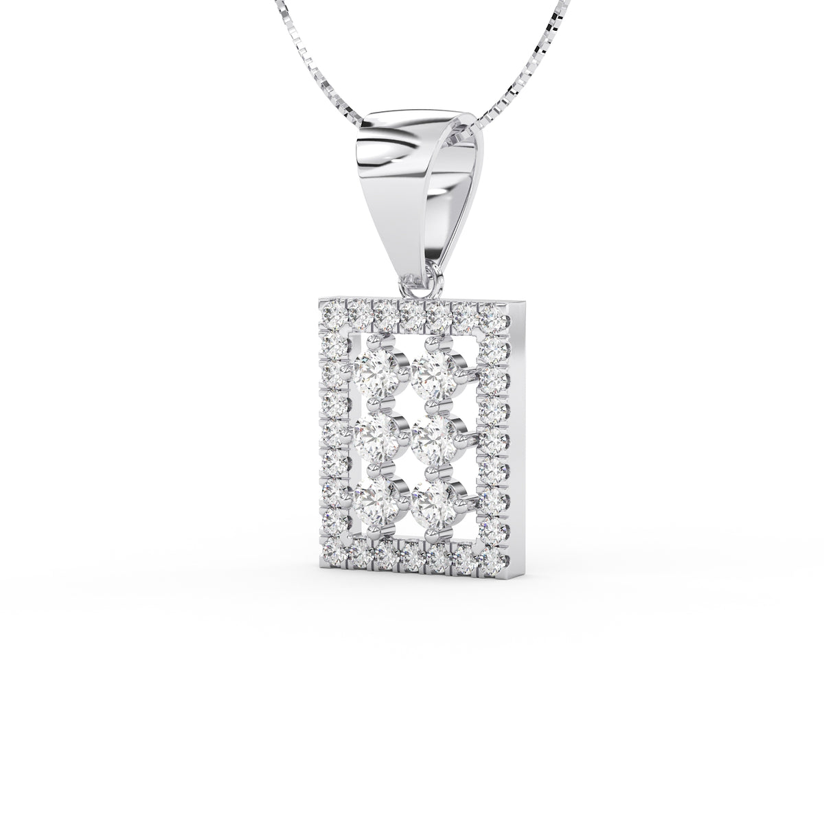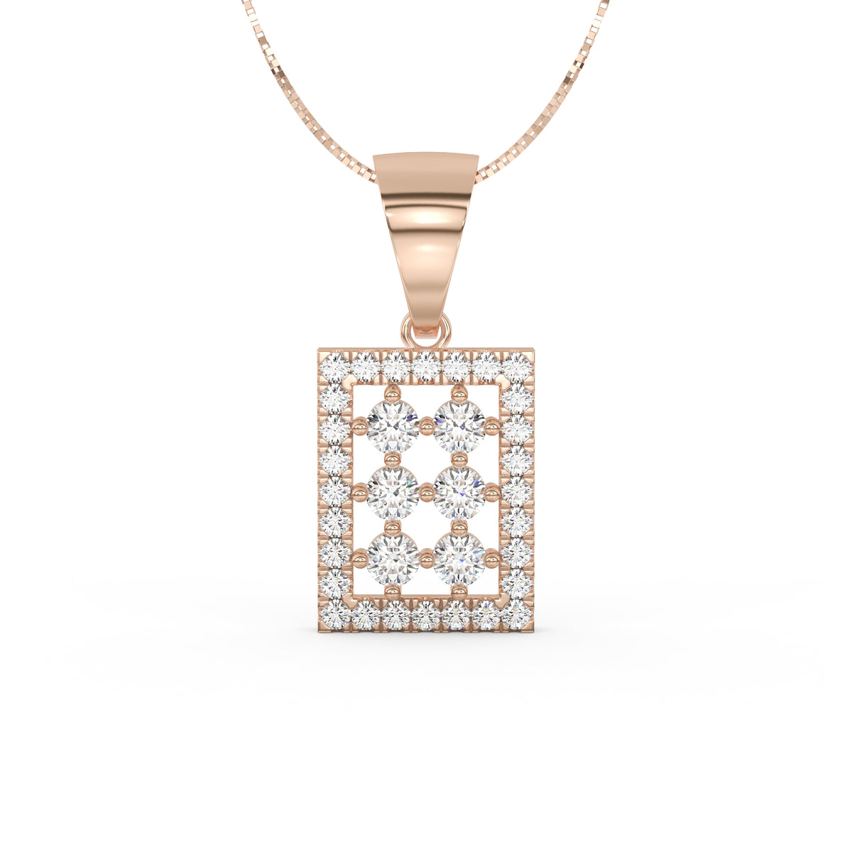 Un carré délicat de diamants vient entourer cette disposition centrale. Les 28 diamants de pavage, pour un total de 0,28 carat, apportent une brillance régulière et subtile, soulignant la géométrie du pendentif tout en conservant une grande légèreté visuelle.