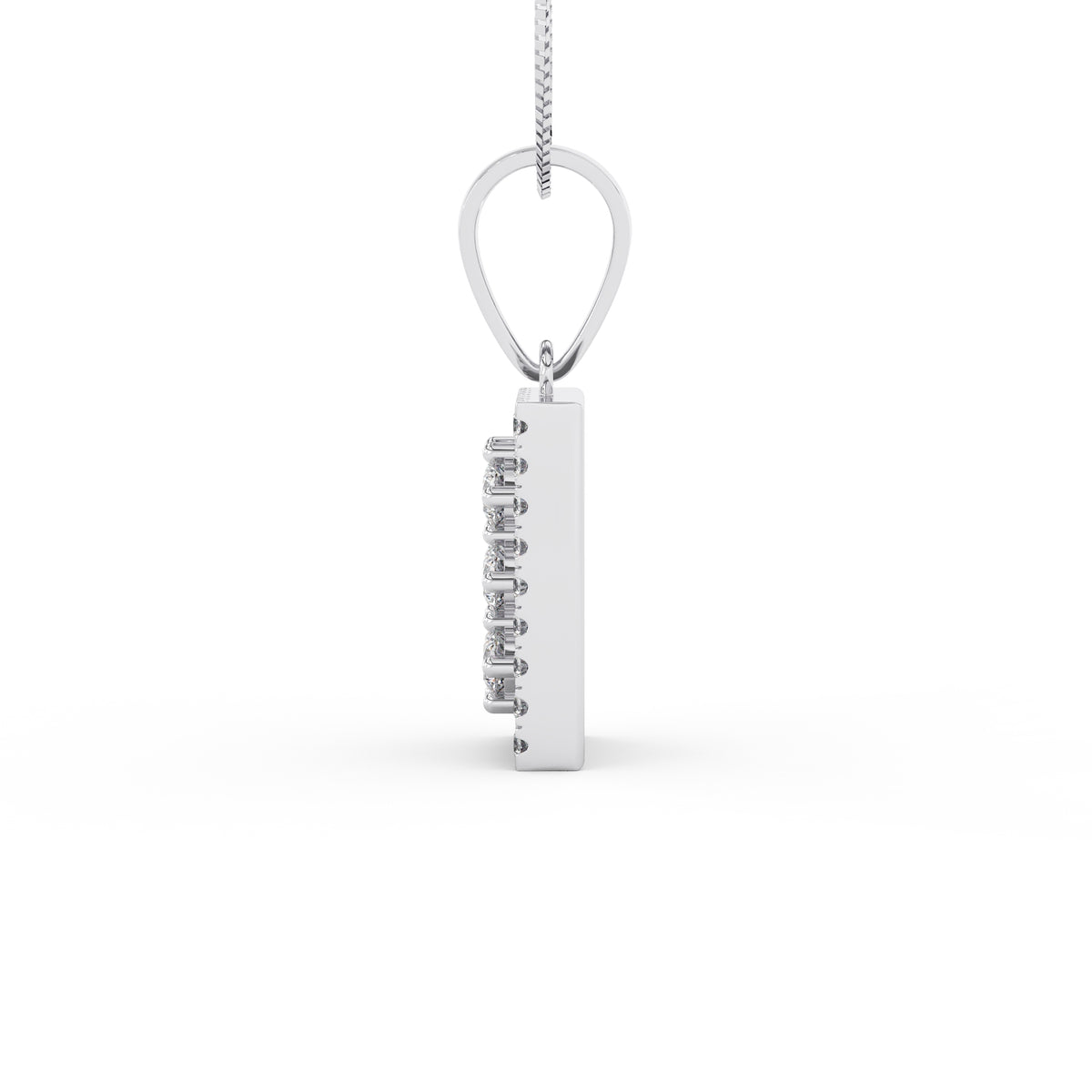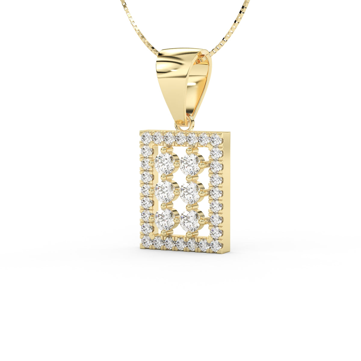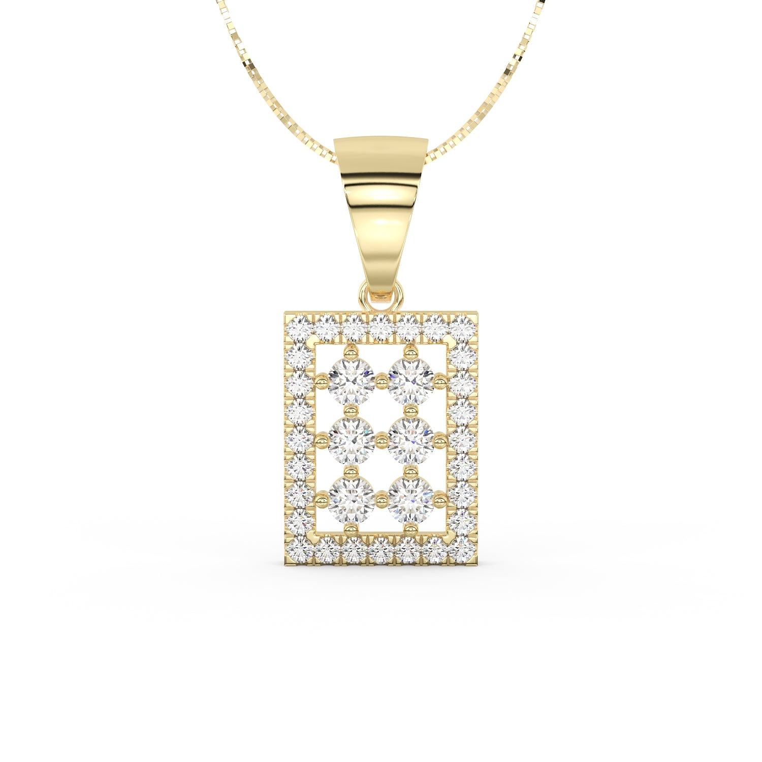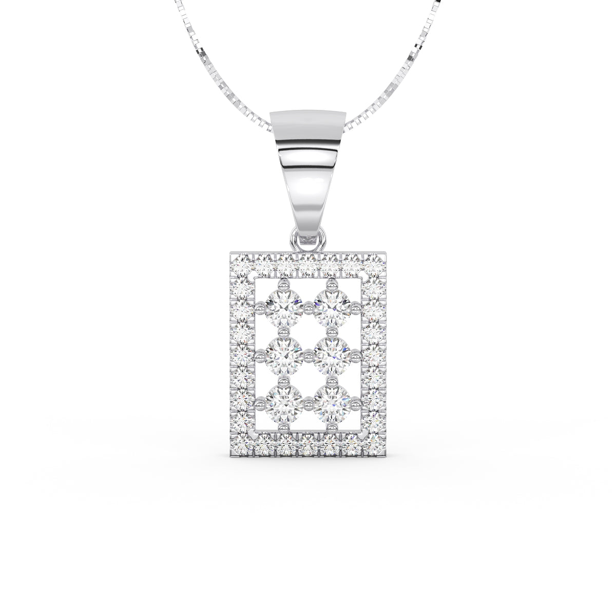 Un carré délicat de diamants vient entourer cette disposition centrale. Les 28 diamants de pavage, pour un total de 0,28 carat, apportent une brillance régulière et subtile, soulignant la géométrie du pendentif tout en conservant une grande légèreté visuelle.